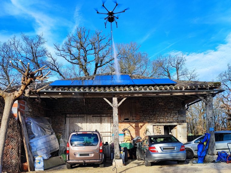 Les drones offrent des avantages significatifs, notamment la capacité d'intervenir dans des zones difficiles d'accès. De plus, nous utilisons de l'eau déminéralisée afin de garantir l'absence de résidus calcaires, en collaboration avec notre fournisseur local, AdouciLot.