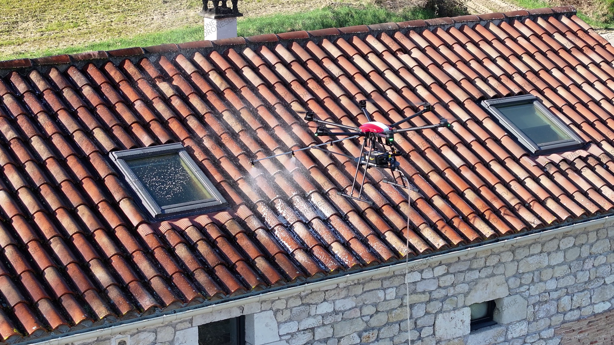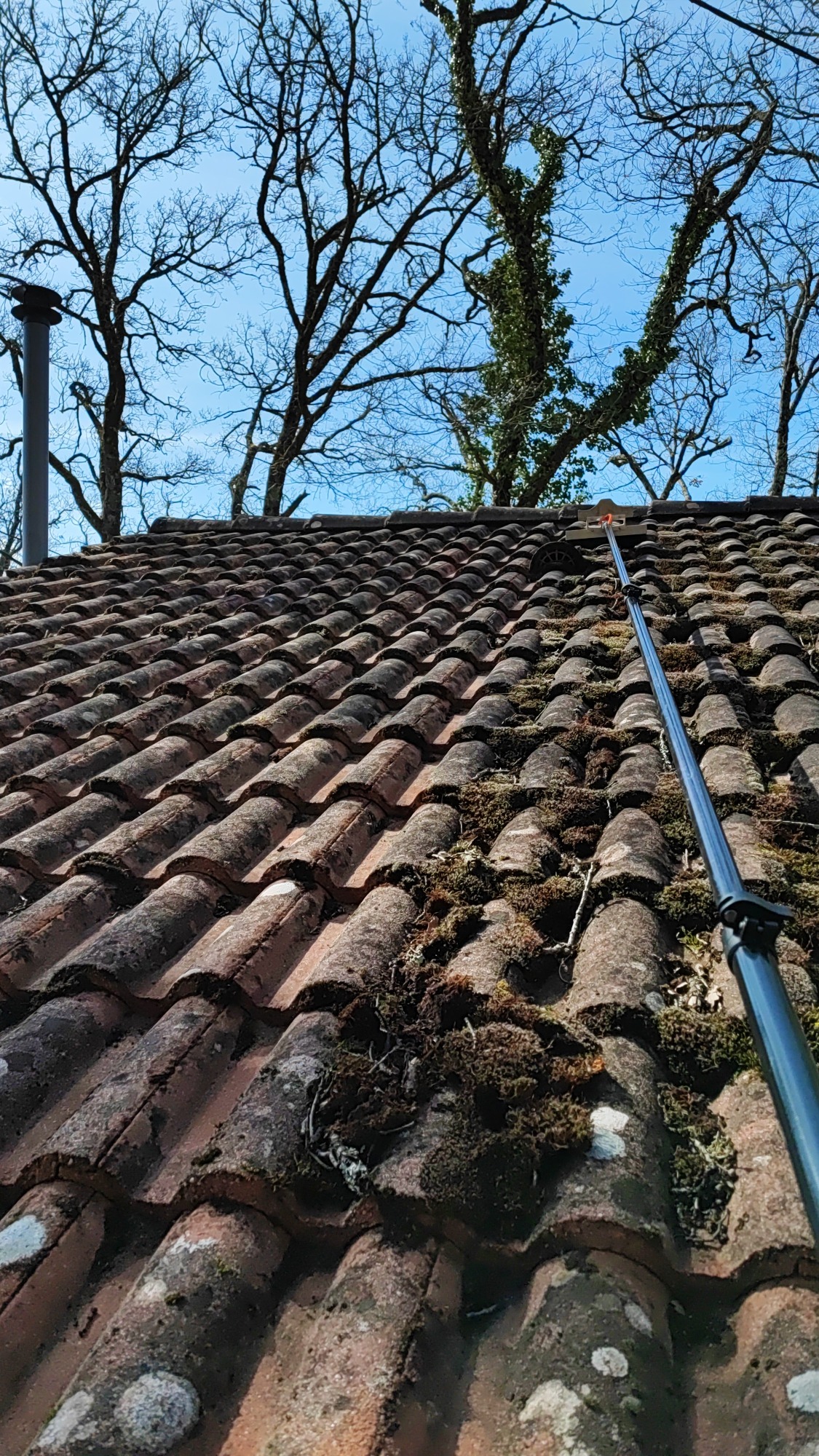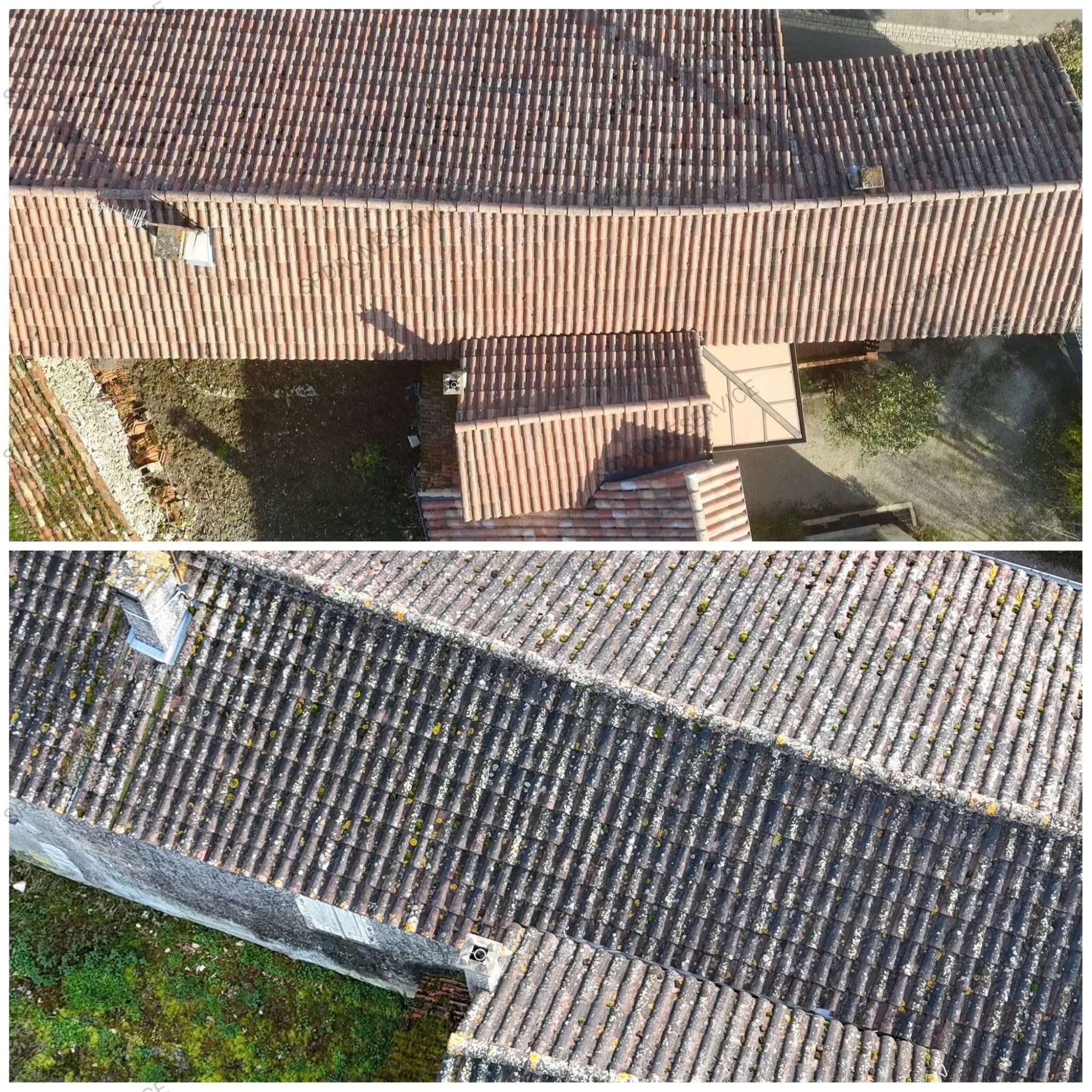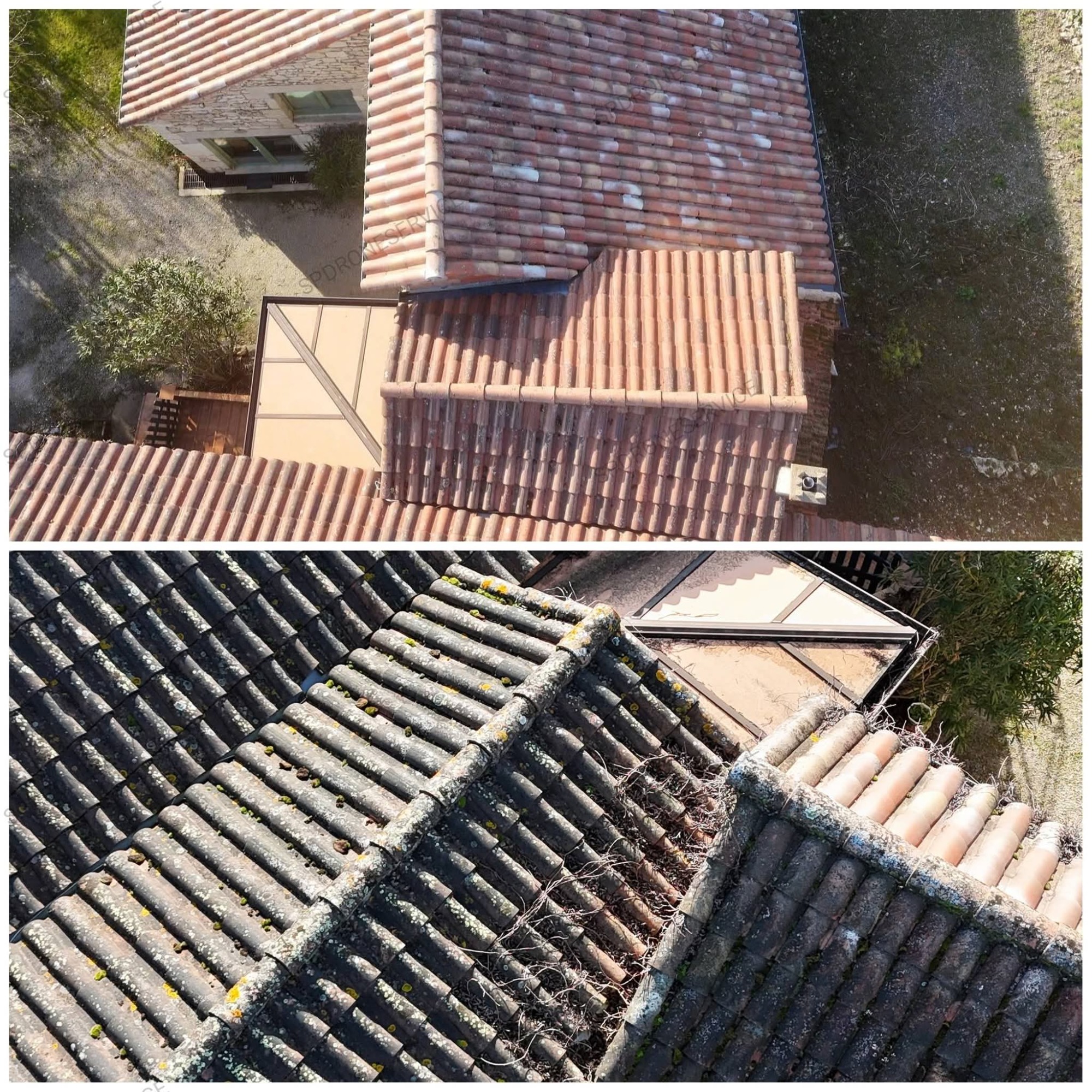Traitement anti mousse et anti fongique, application par drone uniquement sur cette toiture, le temps continue son travail.