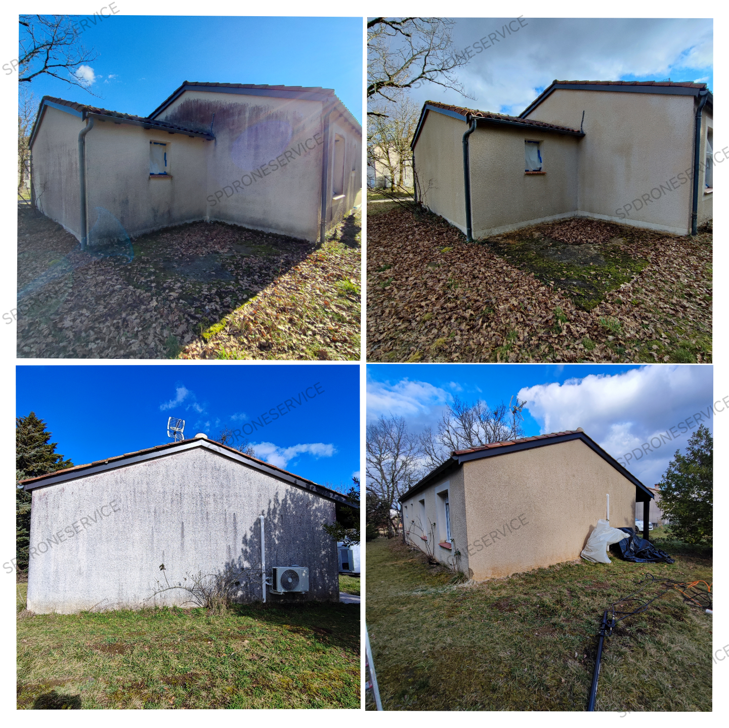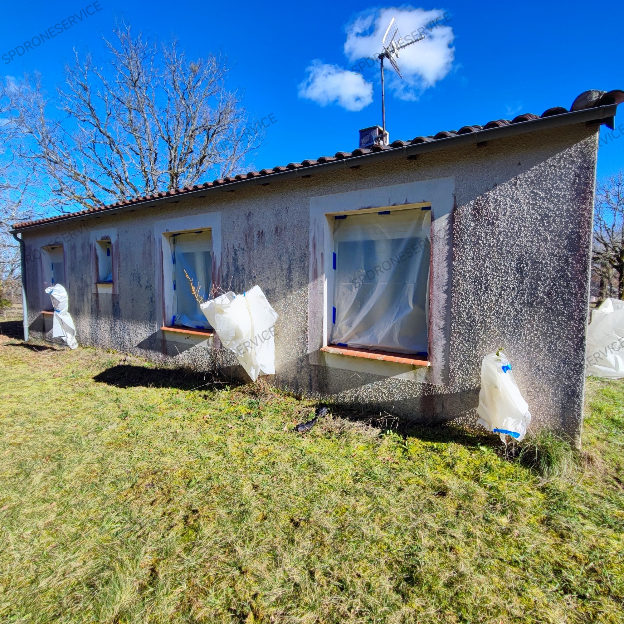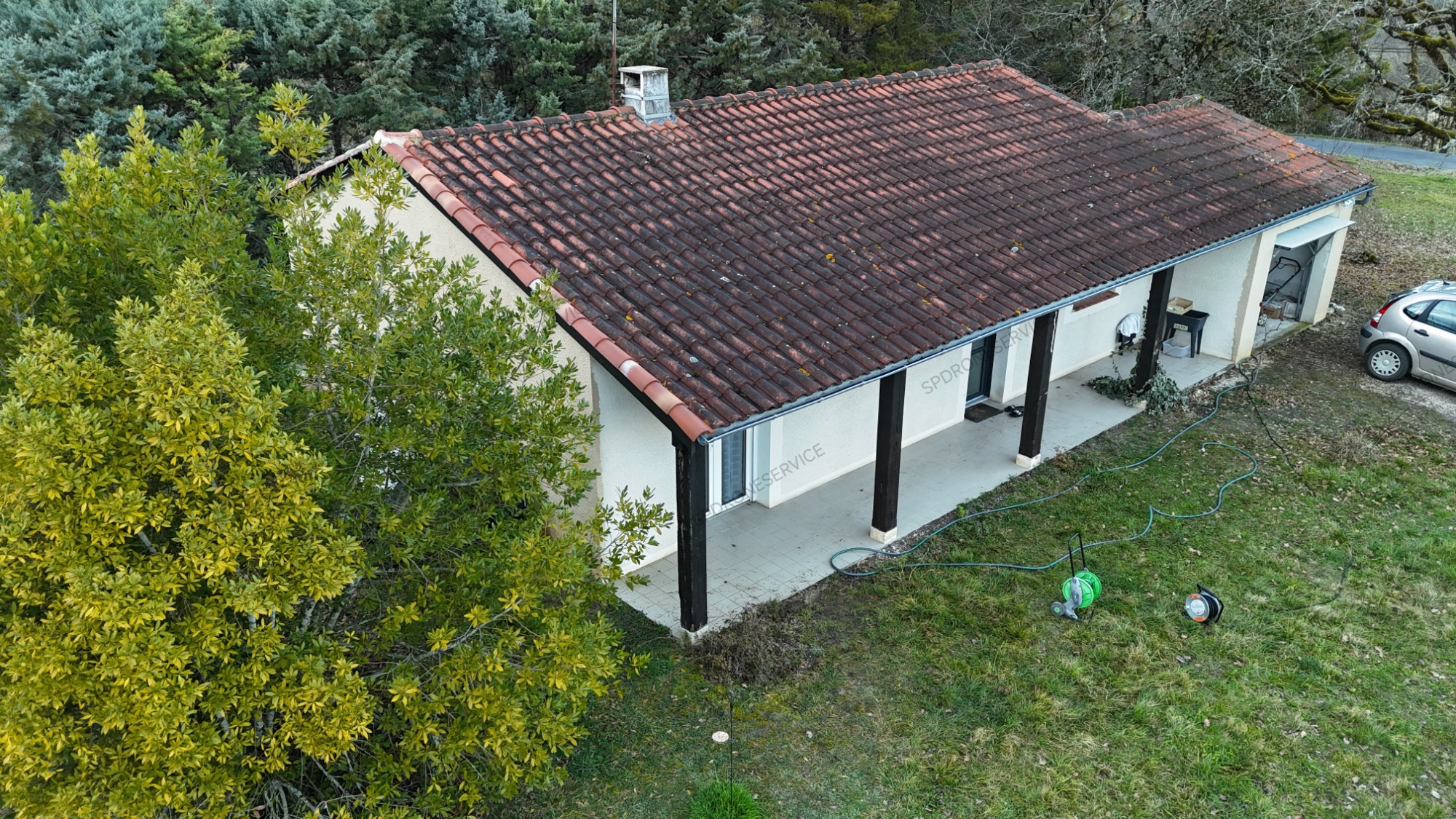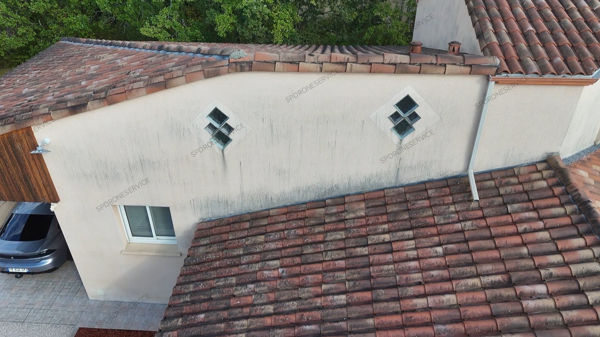 Traitement anti mousse et anti fongique, application par drone uniquement sur cette toiture, le temps continue son travail.