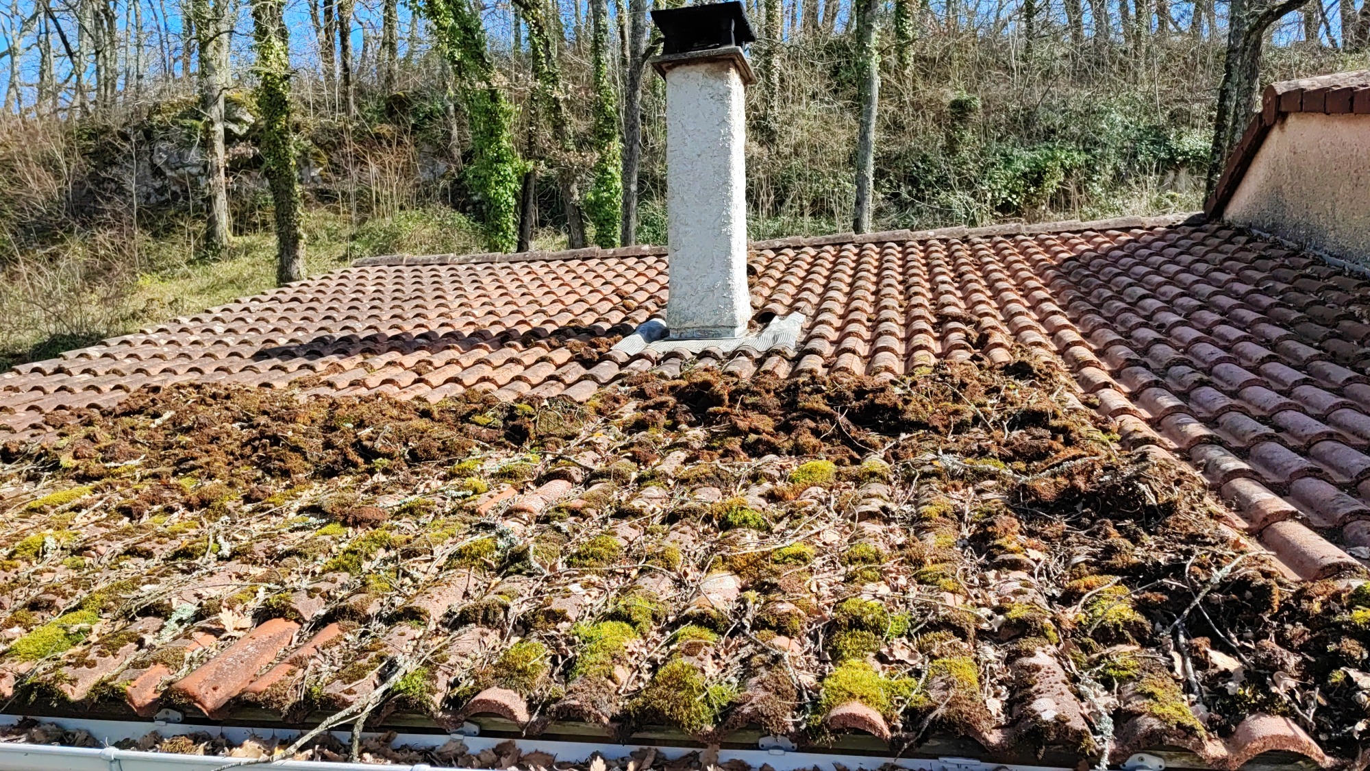 Démoussage à castelnau-montratier. Toiture recouverte de mousses, retrait des mousses avant application d'un traitement anti-mousses